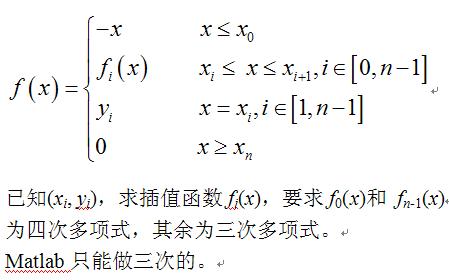 有n个数据点(xi,yi),i=[0,1,...,n],已知两端的导数y'(0)和y'(n),现在想做一个多项式样条插值函数fi,i=[0,1,...,n-1],要求f0和fn-1为四次多项式,其它的为三次多项式。怎么做? 不知道我有没有说明白?希望有高手相助! |