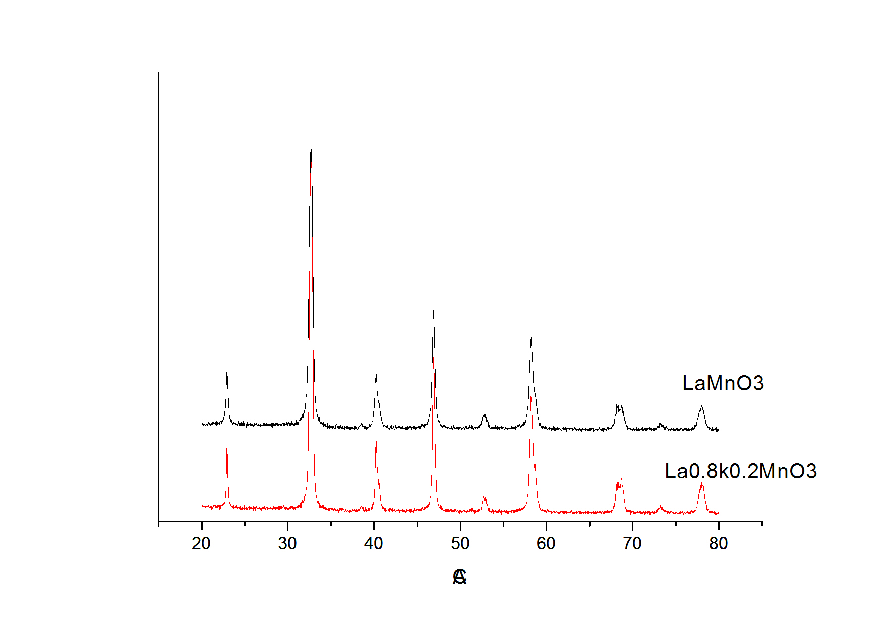 我的样品钙钛矿LaMnO3 在参杂为La0,8K0.2MnO3后XRD衍射角向高角度偏移 但是我查了离子半径,应该是K离子的半径大于La离子的半径,那么取代后应该引起晶格膨胀,向小角偏移啊~怎么正好反了?还是我的理论是不成立的,不会是测试中心标号反了吗。。应该不会的 附带原始数据,1号时LaMnO3 2号时La0.8K0.2Mno3 |
