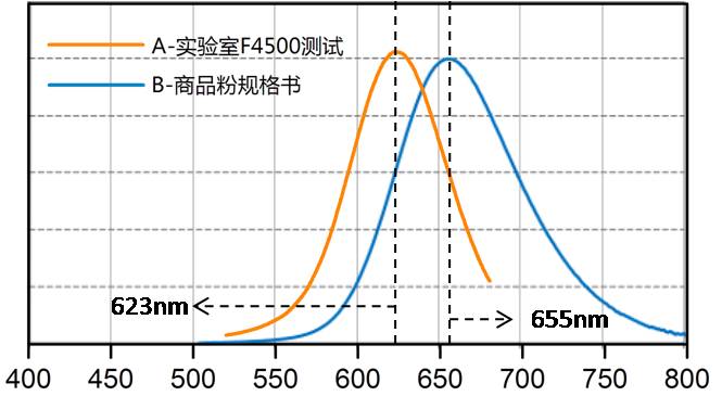 外购的LED荧光粉R,规格书上发射光谱见图中蓝线,写明Emission Peak=655nm;我用实验室的F4500测试,得到的结果是图中黄线;发射波长=623nm。测试的激发波长均为EX=460nm,想知道为什么会出现这种差异?如何更改?(个人认为,粉体和规格书是没有问题,担心仪器有问题,因为我测试其他规格的荧光粉也会有这种偏差:即F4500测出的数据总是比规格书小20nm左右)