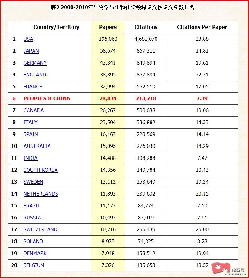 近十年生物学与生物化学领域论文发表前20名国家与地区排名已有2人参与