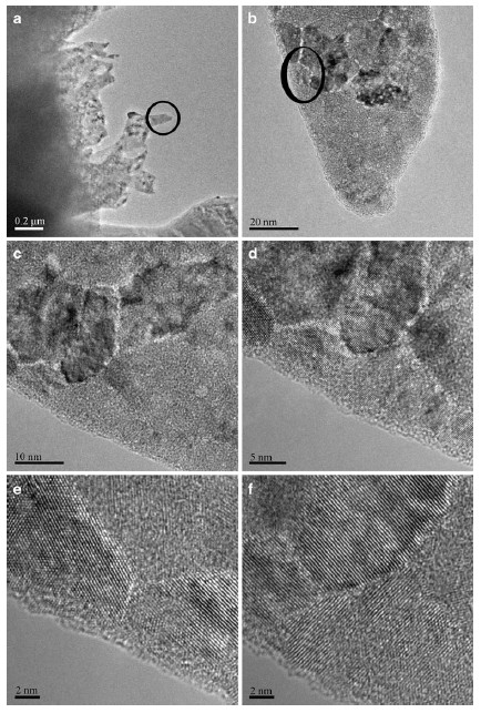 figure 6:Cross-section HRTEM micrographs of typical scrape of (a), further magnification (b) marked with black cirque in (a),  and further magnification (c), (d), (e), and (f) marked with black cirque in (b) of Cd0.96Zn0.04Te (111) crystal ground by a #1500 diamond grinding wheel