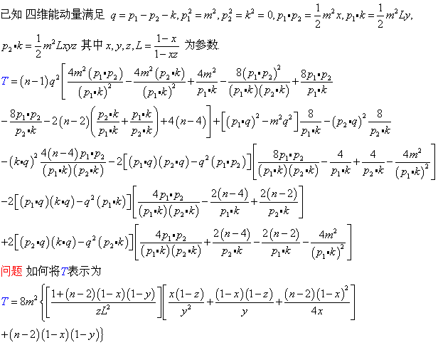 Simplify[T表达式](T表达式中利用代入法,和展开q的办法,使表达式中所有的含有q,p1,p2,k的项全部换成对等的含m,x,y,z,L的项)