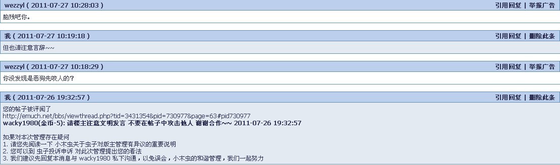 https://muchong.com/bbs/viewthread.php?tid=3431354&pid=730977&page=63 版主对其扣分,辱骂起版主来 继续警告后 |