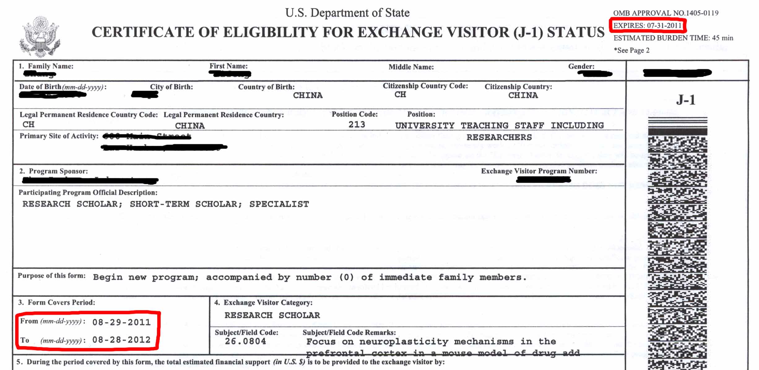在DS-2019表右上角的EXPIRES:07-31-2011是什么意思?谢谢!