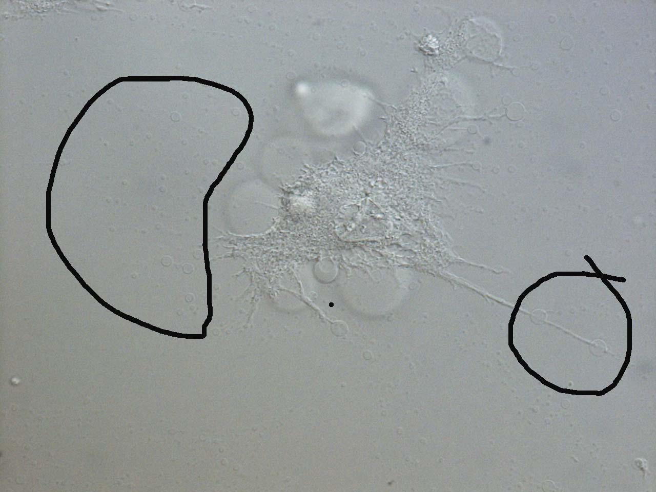 HDF细胞(成纤维状)培养中发现细胞周围有如图所示的泡状结构,未经药物处理的细胞也有,不过非常少,经过处理后有很多。 大的泡状结构好像和细胞很难在一个平面聚焦,小的可以(左边黑圈)。有的泡状结构看似是从细胞上脱离下来的(右边黑圈)。提示一下:我所用药物溶解性不好,可以通过胞吞作用进入细胞。