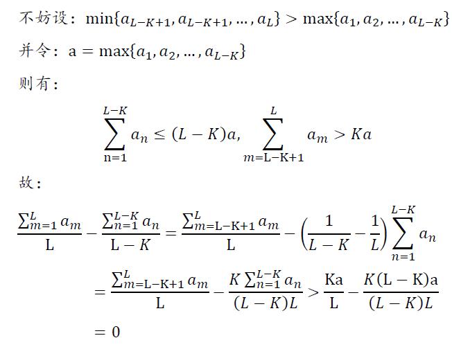 已知a1, a2, a3 ,a4, a5, 假设a4, a5 大于max(a1,a2,a 3) 容易看出 (a1+a2+a3+a4+a5)/5 > (a1+a2+a3)/3 可怎么推导证明呢?可以假设有L个数,其中K个比其他(L-K)个均大,也有类似结论,不知道怎么证明,还请高手赐教。 |