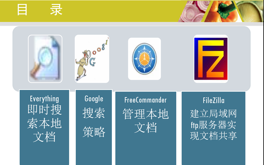 自己做的一个讲座ppt,里面介绍了everything,google search,freecommander,filezilla分别用于文档的搜索,管理及共享。 [ Last edited by flmzxj on 2011-8-7 at 06:21 ] |