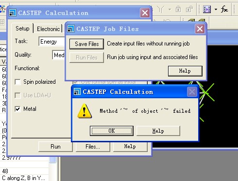 在电脑上装了material studio 5.0 是单机的 在运行CASTEP 中的 save files是出现Method '~' of object '~' failed 如何让解决?如图