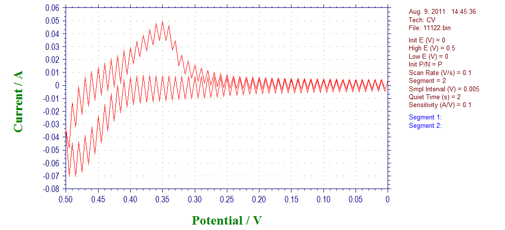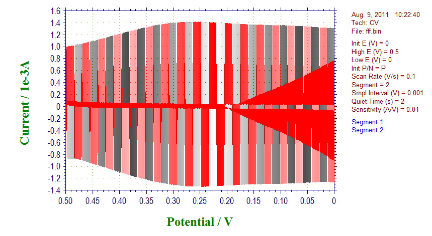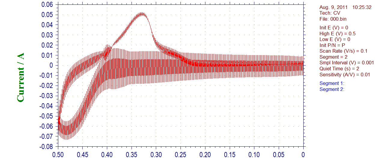 ![]() ![]() 前段时间,运行正常的电化学工作站(CHI760D),今天做三电极体系CV扫描,测试中出现双线(数值一正一负),做线性扫描也是。。。。。 怀疑仪器问题,用标准电阻测试了,一条直线,没问题。 急切求助! 不胜感激! |