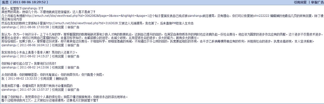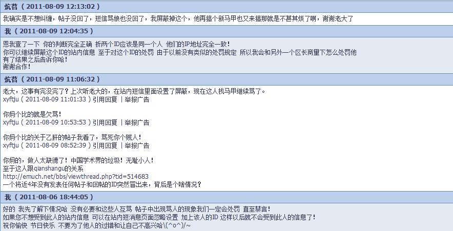 ID为qianshangu 、xyftju虫子由于在帖子中(https://muchong.com/bbs/viewthread.php?tid=3062082&fpage=0&view=&highlight=&page=1 )对于ID为炕苕的虫子的发言不满 在帖子中有互相攻击的行为,遭到处罚后ID为qianshangu 、xyftju的虫子屡次对ID为炕苕的虫子站内信息辱骂,经查两个ID的IP地址完全一致,且都屡次在站内信息中辱骂攻击他人,特对其全论坛禁止访问处理一个月!特此备案! [ Last edited by 凌宇雷池 on 2011-8-9 at 21:29 ] |