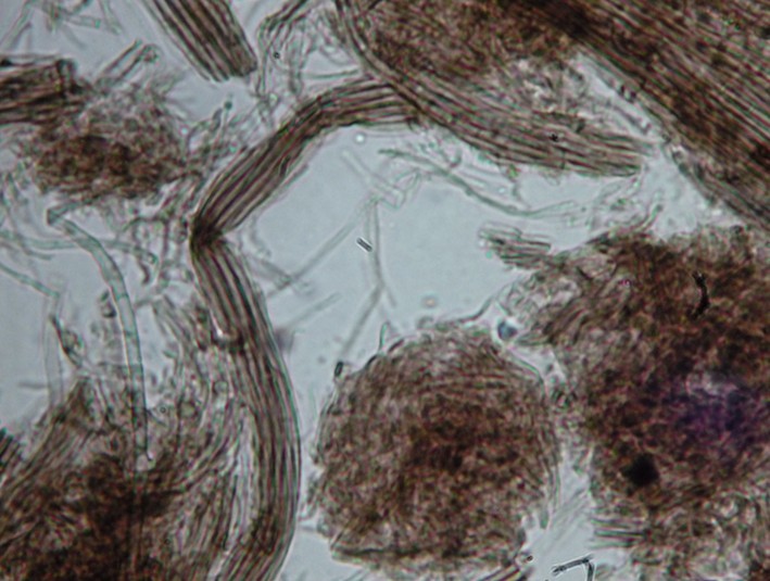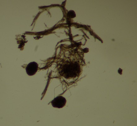 另外球状体压碎了之后,里面是很多断裂的菌丝束和一些短小的菌丝,不知道是不是菌核,跟菌核的描述挺相似的,就是大小似乎对不上。
