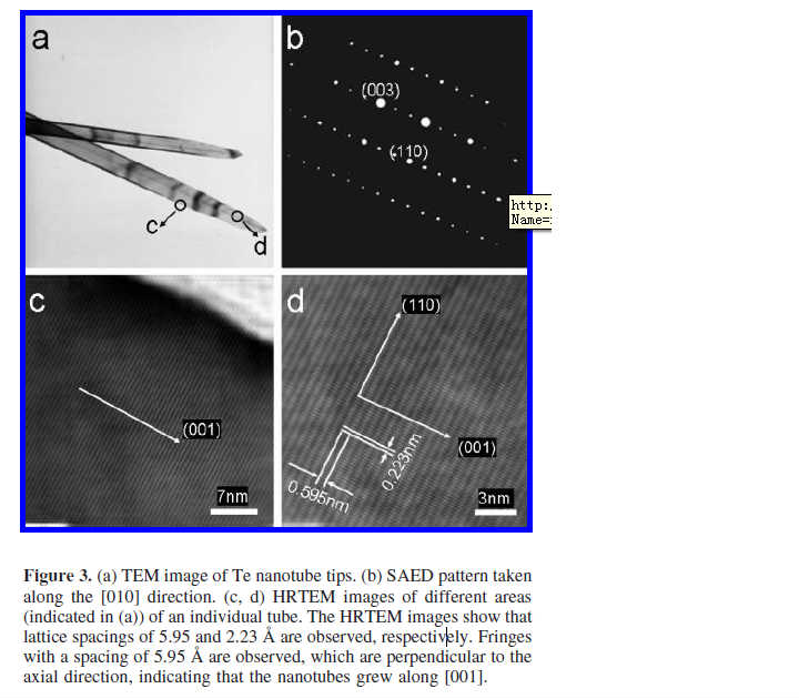高手请教纳米晶表征问题 Figure 3 shows a typical transmission electron microscope (TEM) image and high-resolution TEM (HRTEM) image of the obtained sample, along with selected area electron diffraction (SAED) pattern. HRTEM images in images c and d in Figure 3 show lattice spacings of ca. 2.23, and 5.95 Å, respectively, corresponding to the lattice spacings of the (110) planes, and (001) planes for trigonal tellurium, respectively. The corresponding SAED pattern taken along the [110] direction on the Te tubes indicated that it is single crystalline (Figure 3b). The combination of the results by HRTEM and the SAED pattern confirmed that the axis of the nanotube is along the [001] direction, |
