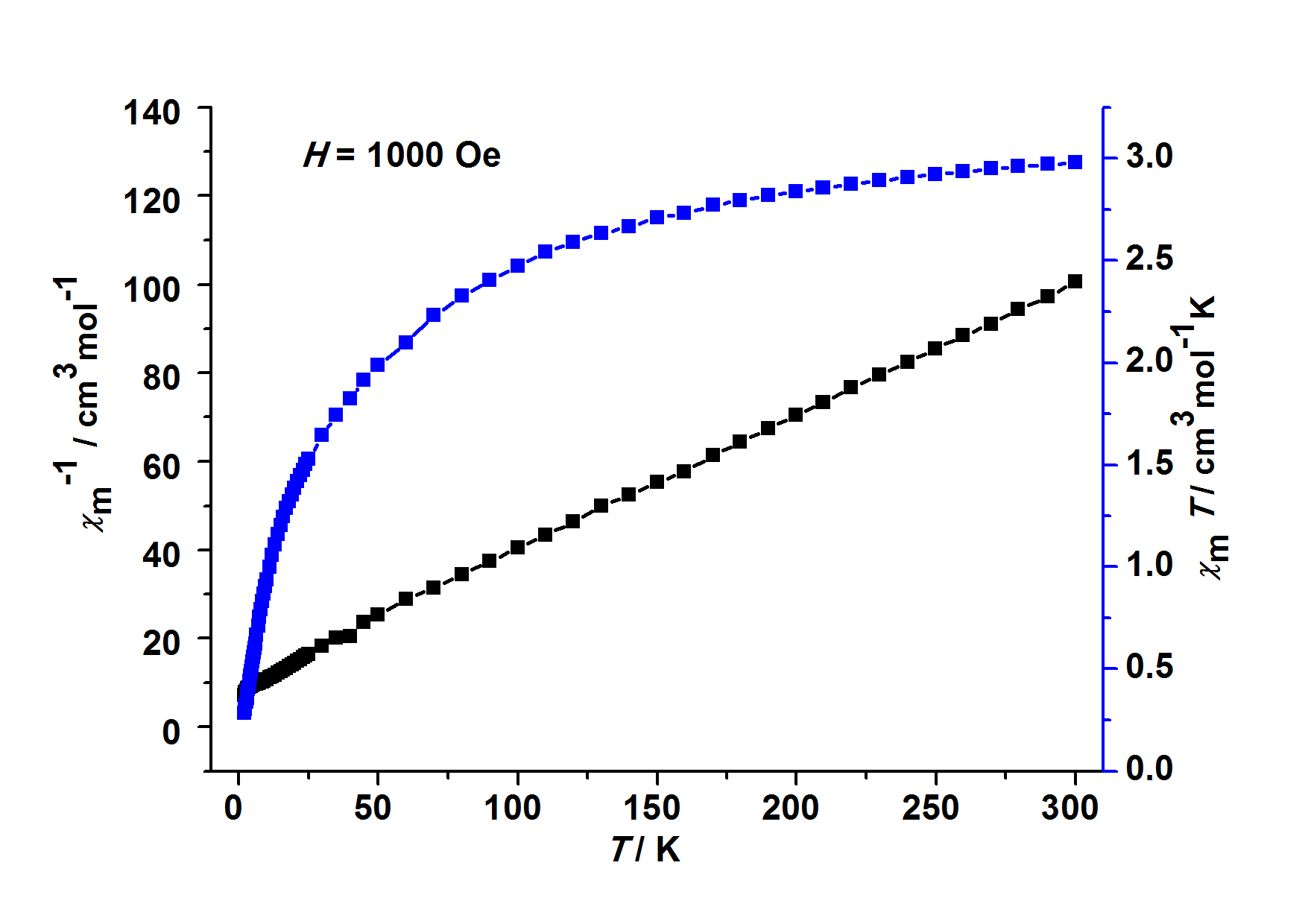 对磁性很不了解 麻烦高手了 第一个化合物Co(II) 由xT-T 可以看出是反铁磁的,但是只考虑自旋的话,饱和值对不上。考虑璇闺耦合的话,应该怎么进行? 第二个化合物 这个是反铁磁么?在origin中用线性拟合怎么选择范围? |