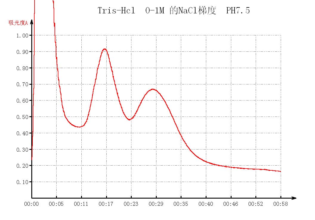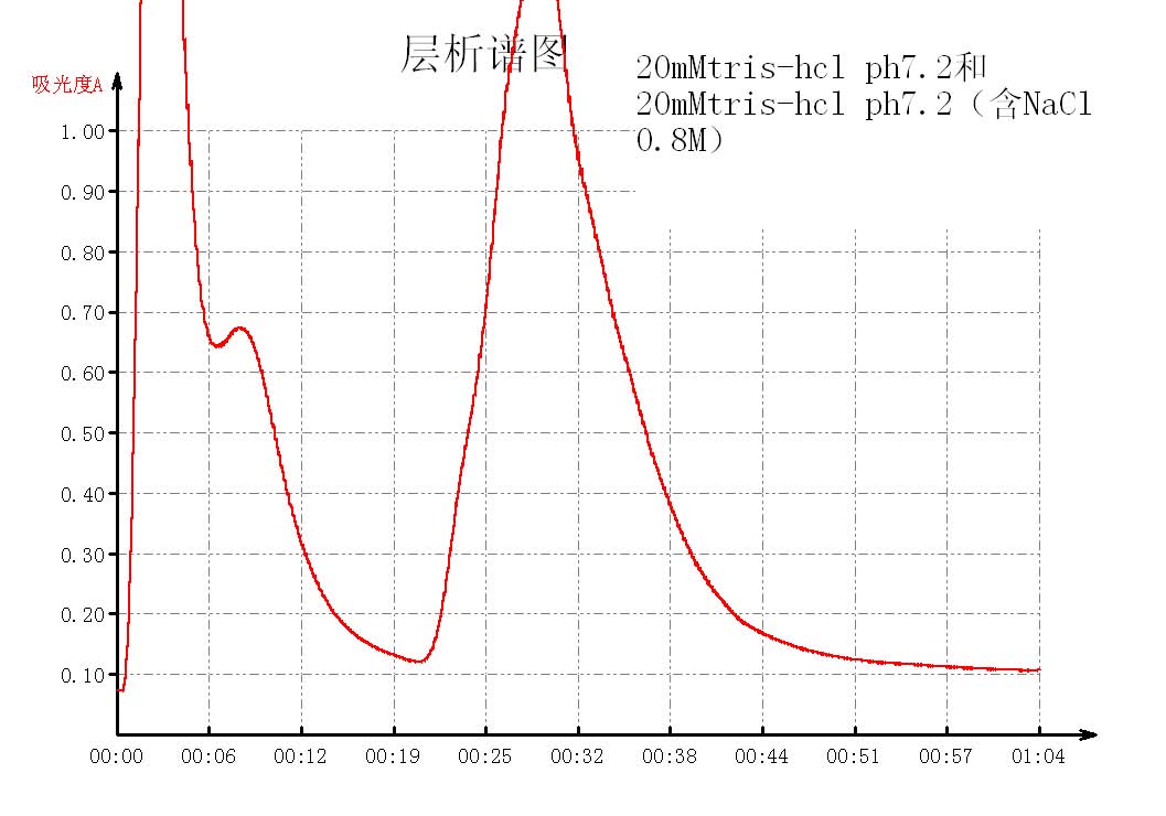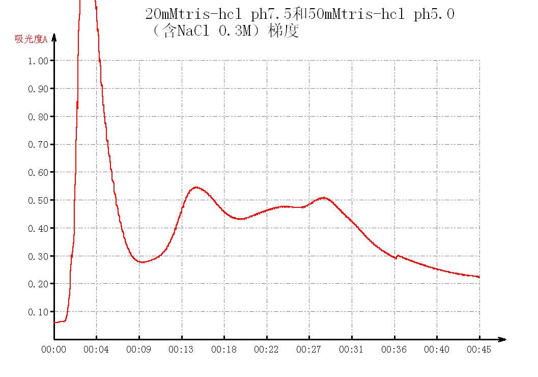 1、我没听说过Tris-醋酸这个缓冲液,你有没有试过Tris-盐酸缓冲液? 2、你的两个洗脱液用的是20mmo/L pH7.5 Tris一乙酸缓冲液和50ml 50mmol/L pH5.0Tris一乙酸缓冲液(含0.3mol/L 氯化钠),看来你是想用pH梯度和离子强度一起来制造一个洗脱梯度,这样做有什么依据吗?我认为这样会引入误差,因为两个因素制造的梯度可控制性可能会弱于一个因素。如果用pH值,不知道稍低的pH值会不会引起蛋白质失活,所以我喜欢用离子强度作为洗脱梯度,起始缓冲液和洗脱缓冲液的pH值相同,但是氯化钠分别为0和1M,能制作出一条从0-1M的连续线性梯度。这样结果也更好分析。 3、两个峰即使是顶点能分开,但交叉很大也是不纯的。DEAE在我的实验里分离效果差,比不上其它的阴离子交换层析柱,如果有别的层析柱,也可以联用。 4、层析柱1*20没有意义,计算柱体积才有意义。 |