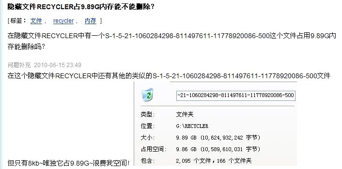 文中叙述有误,这个文件夹占用的是硬盘空间,不是内存。 回收站RECYCLER中根据系统中每一个用户分别设置了各自的回收站,S-1-5-21-***是操作系统为某个用户建立的UID号,若该用户账户有效的话,在注册表HKEY_USERS下面可以看见对应UID号的键值。 估计你无法解密的主要原因是没有对该账户文件操作的权限,建议先对系统管理员权限登录系统,为当前用户赋予RECYCLER及所有下属文件夹的完全控制权限,这样可以对RECYCLER中的该文件夹进行读取、删除、解密等操作了。 |