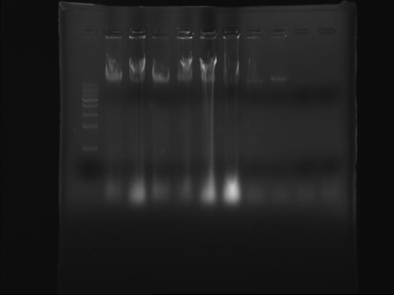 各位大侠,为什么我提取的DNA总是降解呢?用的是传统的苯酚-氯仿抽提的方法,最后一步加入冰乙醇沉淀的时候能看到大量的絮状沉淀,TE溶解过夜,琼脂糖胶检测时条带却是这样(如图)。分光光度计检测浓度和纯度都正常。实验室几个人提取都是这样,不知道是什么原因,所用的试剂已经重新配过,还是这个结果。请问有没有遇到过类似情况的,这是什么原因,怎么解决呢?请大家指点帮助~ |