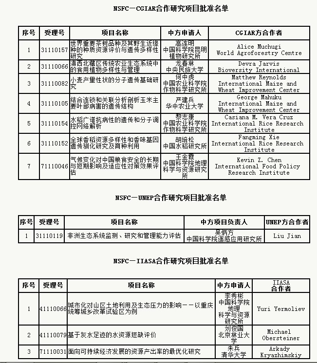 基金委公布三个国际合作研究项目批准名单 近日,国家自然科学基金委员会公布了2011年国家自然科学基金委员会(NSFC)与国际农业磋商组织(CGIAR)、联合国环境规划署(United Nations Environment Programme, UNEP)以及国际应用系统分析学会(IIASA)的合作研究项目批准名单,具体如下: 原文请见: 2011年度国家自然科学基金委员会与国际农业磋商组织合作研究项目批准通知http://www.nsfc.gov.cn/Portal0/InfoModule_396/34811.htm 2011年度国家自然科学基金委员会与联合国环境规划署合作研究项目批准通知http://www.nsfc.gov.cn/Portal0/InfoModule_396/34810.htm 2011年度NSFC-IIASA合作研究项目批准通知http://www.nsfc.gov.cn/Portal0/InfoModule_396/34809.htm 转载于http://news.sciencenet.cn/htmlnews/2011/8/250947.shtm [ Last edited by xuanzhang on 2011-8-18 at 20:44 ] |