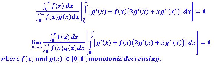 如图,有没有什么关于积分乘积的定理可以用?多谢指导! f(0)=1, g(0)=1, f(infinity)=0, g(infinity)=0; f'(infinity)=0, g'(infinity)=0; f''(infinity)=0, g''(infinity)=0. 或者证明: [ Last edited by lenienter on 2011-8-19 at 15:50 ] |