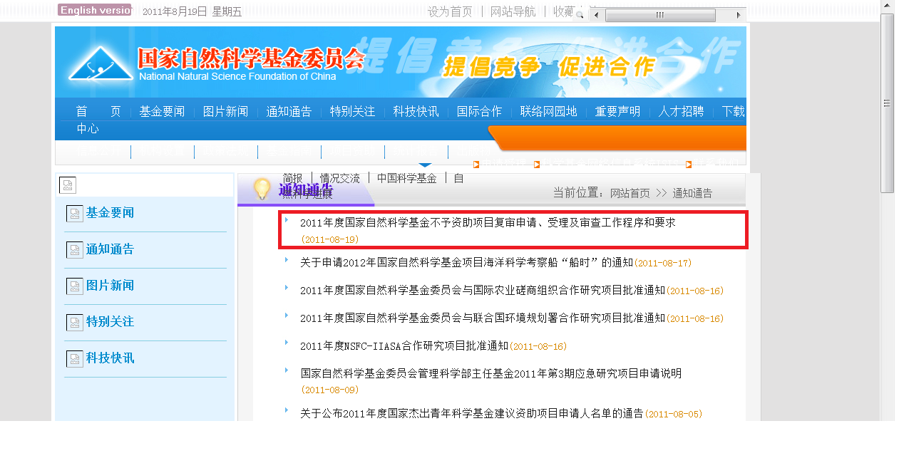 2011年度国家自然科学基金不予资助项目复审相关通知还在基金委网上已有19人参与