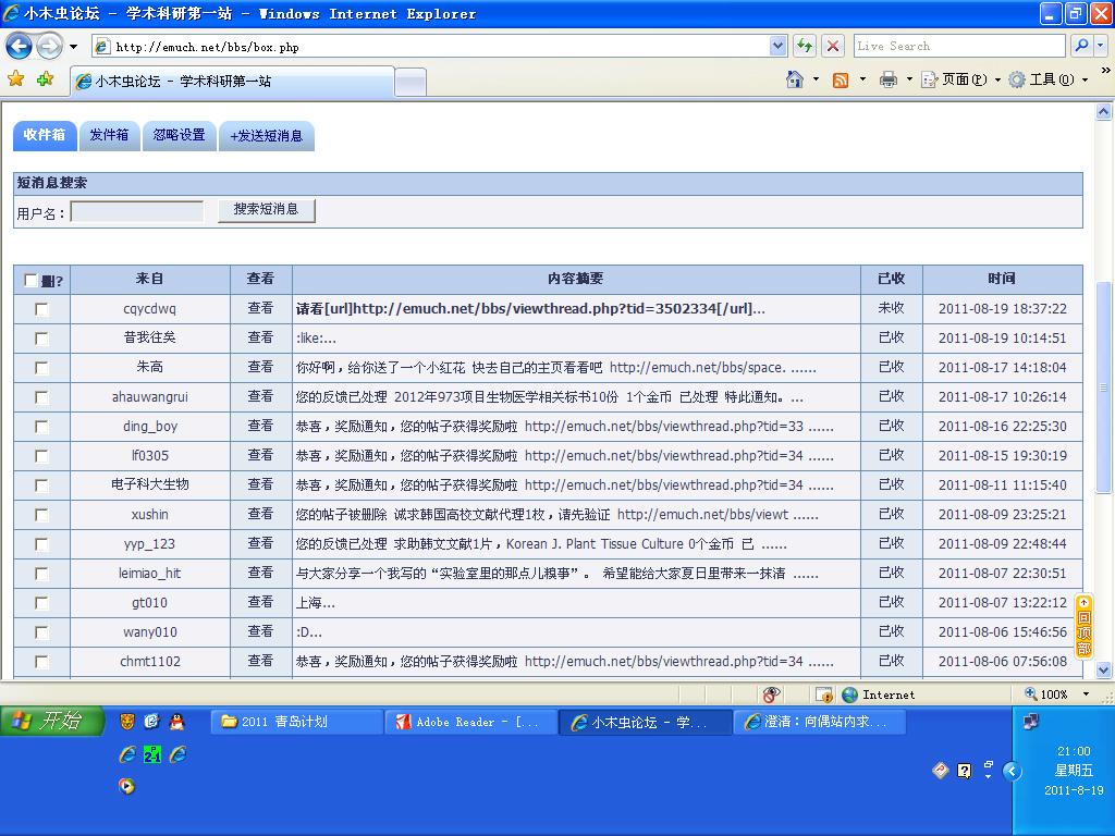 图中的虫子看过来,你们的站内短信已删除(比对后面2张图图可知)。 偶也不能查询,还求助过其他虫子。 希望虫子们都高中,没中的明年又是一条好汉。 中的伟大,挂的光荣。 [ Last edited by gene112 on 2011-8-19 at 21:01 ] |