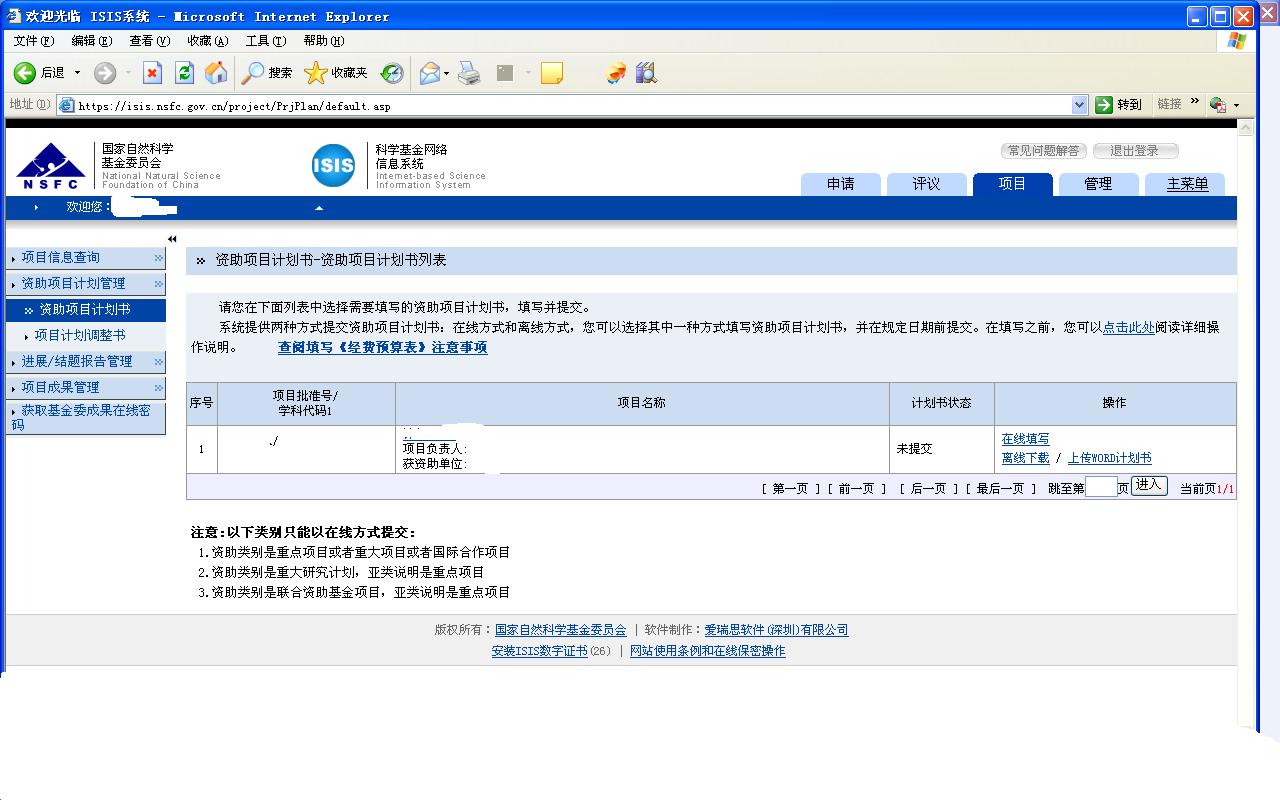 用此进入后,在资助项目书里:项目批准号/学科代码1 项目名称 计划书状态 操作