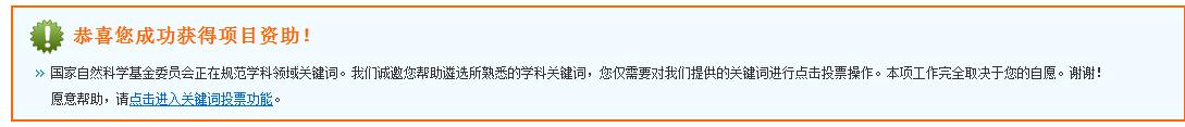 大家登录自己的ISIS系统后,见过下面的祝福吗?我2011年没有获得资助。 恭喜您成功获得项目资助! 国家自然科学基金委员会正在规范学科领域关键词。我们诚邀您帮助遴选所熟悉的学科关键词,您仅需要对我们提供的关键词进行点击投票操作。本项工作完全取决于您的自愿。谢谢! 愿意帮助,请点击进入关键词投票功能。 |