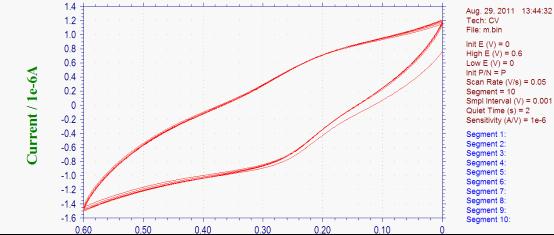 最近在铁氰化钾(0.5mmol/L)溶液中,用循环伏安(0~0.6V)扫描三电极系统(铂盘电极(0.5mm),银/氯化银参比电极,铂丝辅助电极),只有氧化峰,没有还原峰。有前辈可以告诉我是电极出了什么问题吗? 电极已经磨了很久了,一直是这样 |