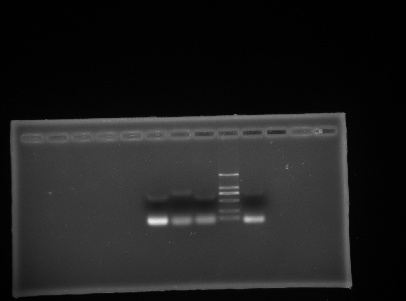 你这个明显的是有产物,但不知道这个产物的长度是不是你预计的长度,如果是的话,你应该只是优化下后面的两轮PCR就可以了,不知道你点样的体积是多少,实在不行你扩大2轮反应的体系,大量回收,只要是你需要的序列你胶回收就可以测序了。你的引物2聚体比较亮啊