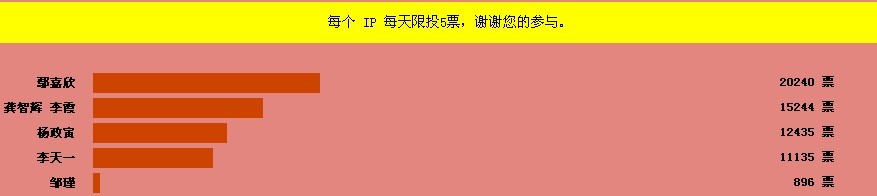 ![]() http://www.5tv.com.cn/superkid2011 ,我侄女名字叫邹瑾,11号选手, 这是她参加一个幼儿节目,我作为姑姑理应为她拉拉票其它也做不了什么了,呵呵^_^,我小侄女的视频,http://www.5tv.com.cn/superkid2011/videos/7768大家看后若认为不错的话,请投出您宝贵的5票,呵呵因为可以刷新页面5次,所以每个IP可以投5票,每天都可以投5票,非常感谢! ![]() 天啊,听我弟弟说是断了网络IP变了可以连续投,没有时间限制每天都可投。辛苦大家了!刚得到好消息,宝宝已经进入总决赛了,9月10号开赛,这期间一直可以投,哈哈 [ Last edited by zouyan2007 on 2011-9-1 at 22:38 ] |