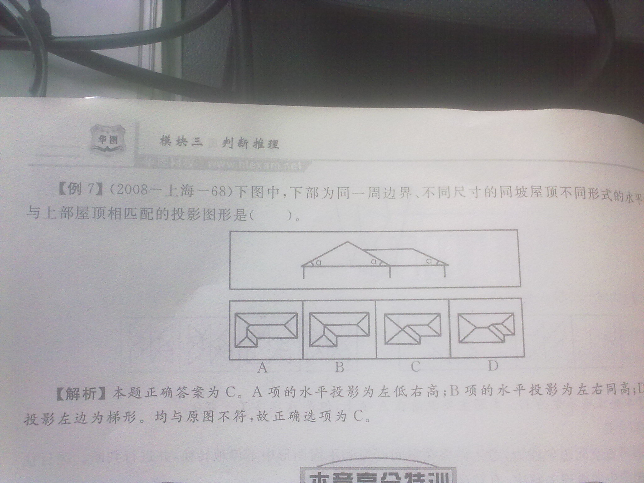 题目为水平投影,ABCD选项为上部投影。 四个选项首先可以排除D,这个很明显。再看ABC,水平投影可知,上部屋顶明显看出左高右低。B图显然左右等高,排除掉。只剩下A和C,如何筛选出正确答案,具体的图我也传不上来,可能说的很混乱,立体角度来看,A表现为左低右高。正确答案就是C了。 建议你还是找个实物实际去感受一下,那样更直观,把主视图、俯视图和左视图的图自己画下来。就会明白了。 希望能够帮到你,如若不明白,坐等高人吧。呵呵 |