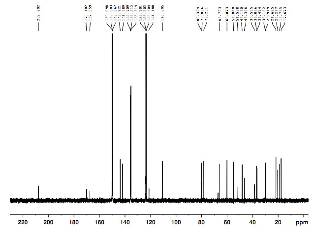 我觉得像是柠檬苦素类的,6.5、7.6、7.7,110、121、142、143判断为一个呋喃环,167、170、207分别为三个羰基,从氢谱和碳谱上看出4个甲基