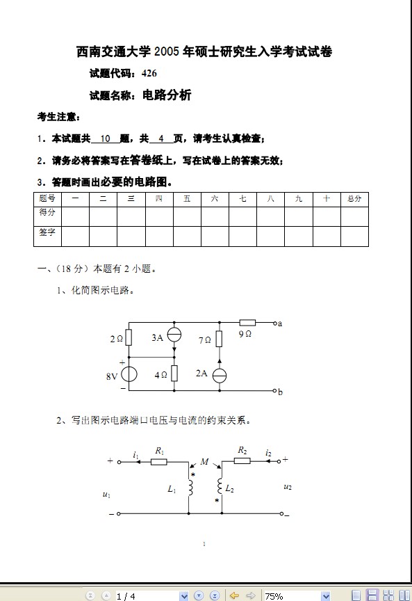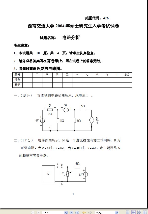 【试卷资源】西南交通大学硕士研究生入学考试《电路分析》十年真题