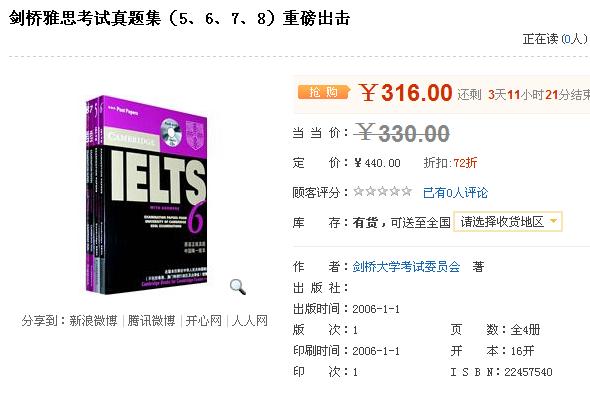 小弟最近要准备考雅思,但由于刚入门,请各位推荐下参考书吧?最好有出版社,出版年份,同时也请大家给些学习经验,谢谢啦! 听说应该买剑桥雅思考试真题集5-8.不知道是不是下面这本? [ 来自科研家族 木虫有机 ] |