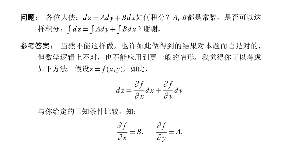 多元函数不能像一元函数一样直接对微元进行积分,因为对一元函数微分与积分在一定条件下可以看作是互逆运算,而对多元函数就不是了。对Adx+Bdy进行积分请参看多元函数中关于曲线积部分的内容。