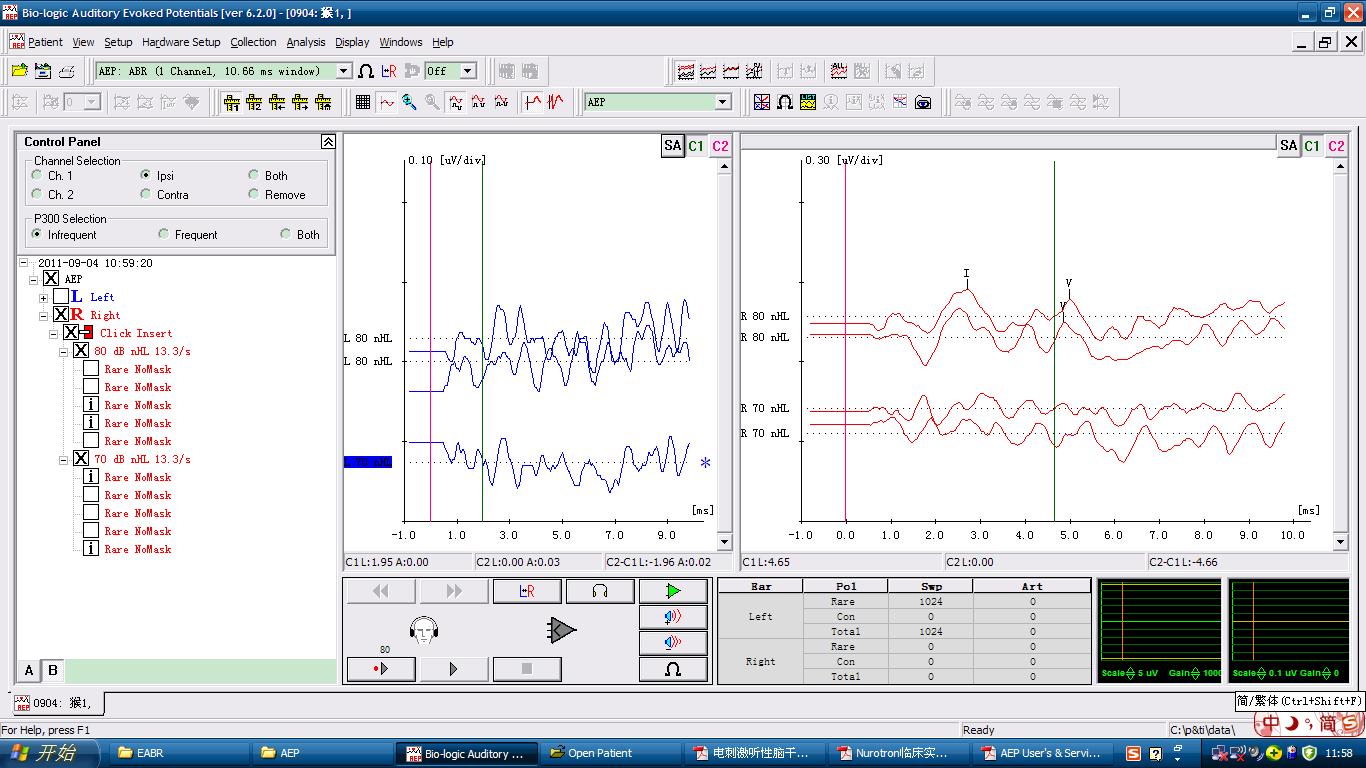 最近一直在搞这个听觉诱发电位啊,所以就老是发类似的贴子....各位不要介意啊。。。。 做了1只猴子的ABR,做了两次,同时所有的参数都是相同的,我不知道的判断的V波对不对,因为不确定潜伏期是否和人的一样,请各位高人指点...... |