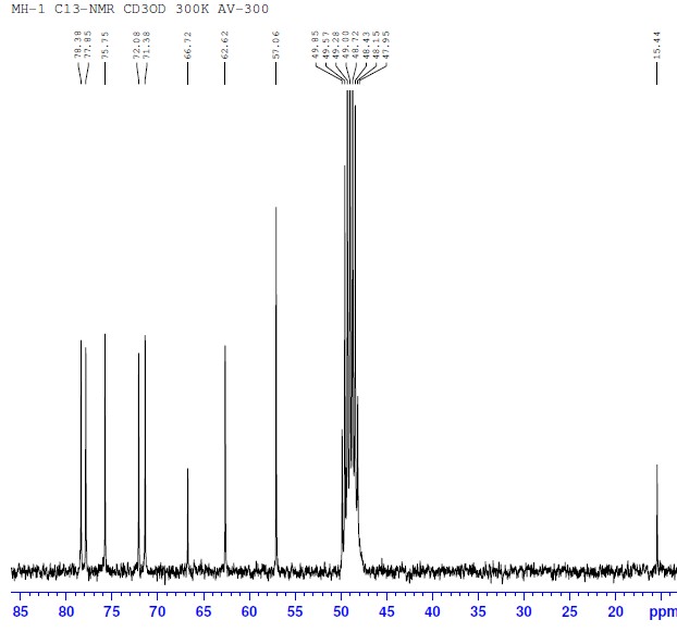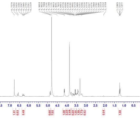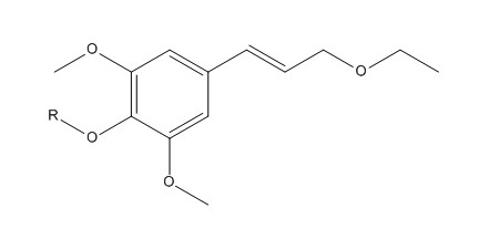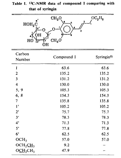 母核应为甲基丁香苷,只是1位处取代基有区别,与Syringin相比,多了15.4,66.7,72.0。根据化学位移判断,72.0与66.7应为连氧CH2,15.4为-CH2CH3的CH3,这样取代基为R=-CH2-O-CH2-CH3,结构如下