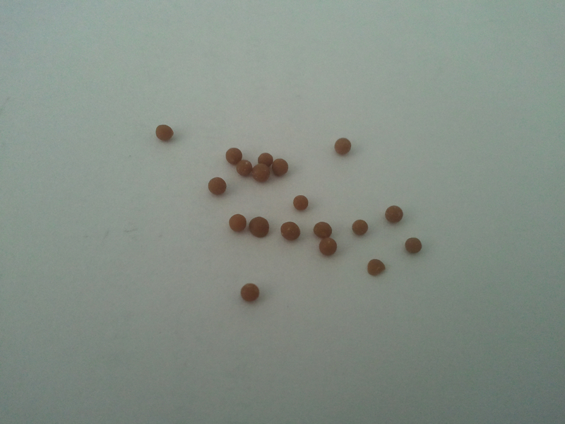在环氧大豆油中发现这种填充物:土黄色,直径在2.5-4mm之间,质地较硬,表面较光滑无明显孔,用小刀加力可以切开,附上照片。