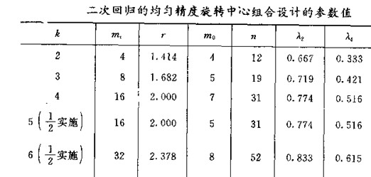 在二次回归的均匀精度旋转中心组合设计的参数值中,Mc为2K设计或其部分实施试验点的次数,但M0是代表中心点的重复次数,这个重复次数是怎么确定应该是多少呢?另外在请教,参数表中 λ2和λ4是什么意思,怎么求它的值 |