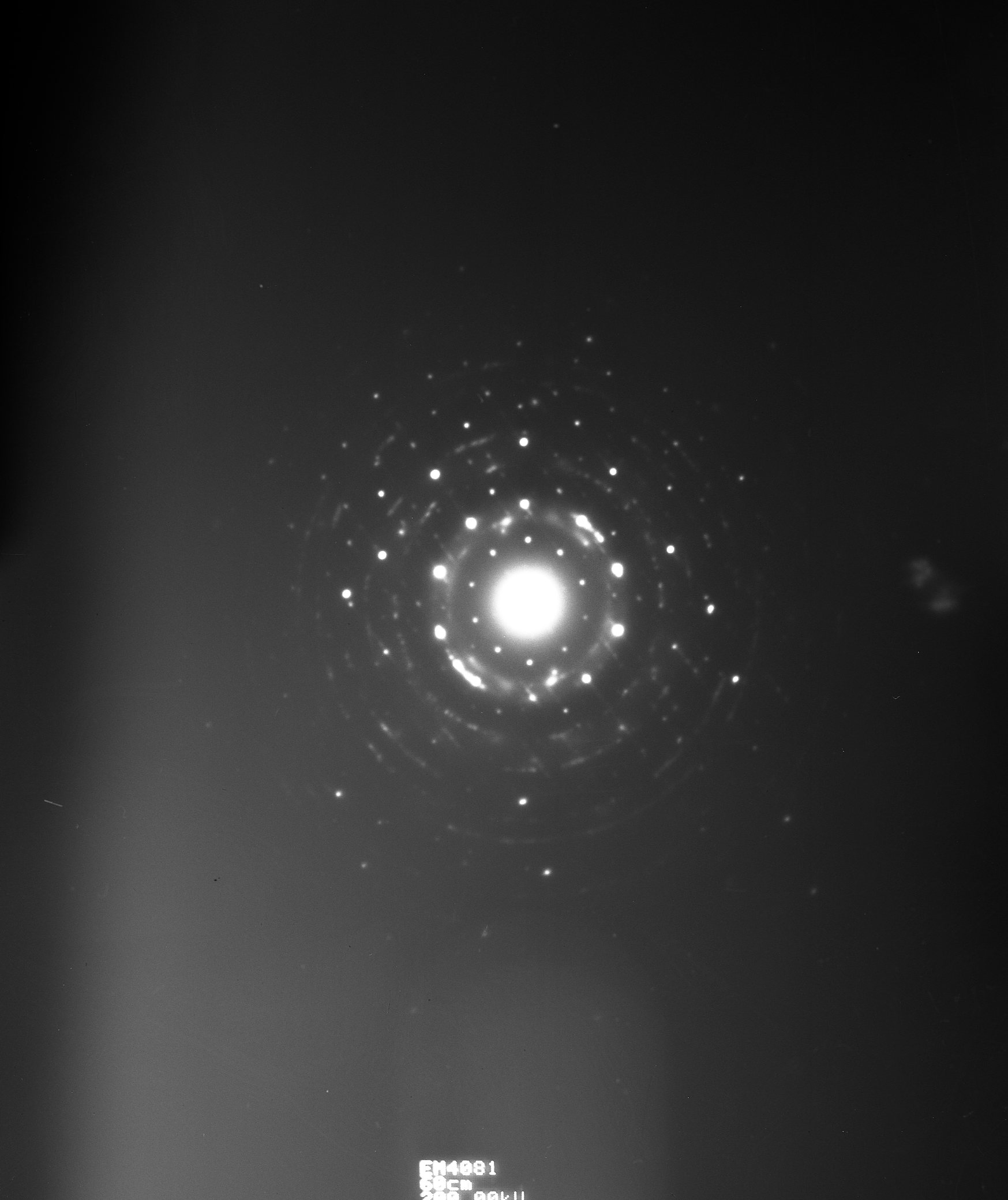 最近在小弟自己的合金发现了些小的Al-Mn颗粒,并用TEM下的选区衍射获得了一些衍射斑点,其中有一些是五次对称的,