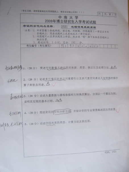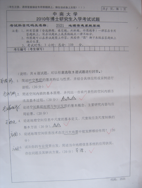 包括两门专业课:地理信息系统原理,地理信息系统工程综合。2007年-2010年的是图片格式,2011年的是记事本格式,包括初试和面试时笔试的试题。给需要报考中南的虫友一点参考。 [ Last edited by flmzxj on 2011-9-14 at 20:02 ] |