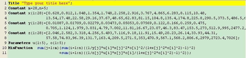 用Lstopt编辑了一个程序,想以该函数最小值作为条件,求解其中μi和θi的值,