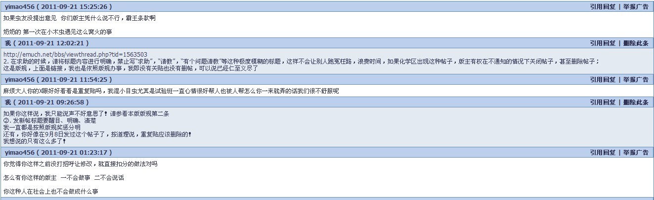 在有机交流版主中发帖,版主进行提示https://muchong.com/bbs/viewthread.php?tid=3617591 对提示不满,利用站内短信对版主进行攻击,版主屡次沟通,无效果,严重影响版主正常的管理工作,故在有机交流版禁言7天,以示警告,希望注意 |
