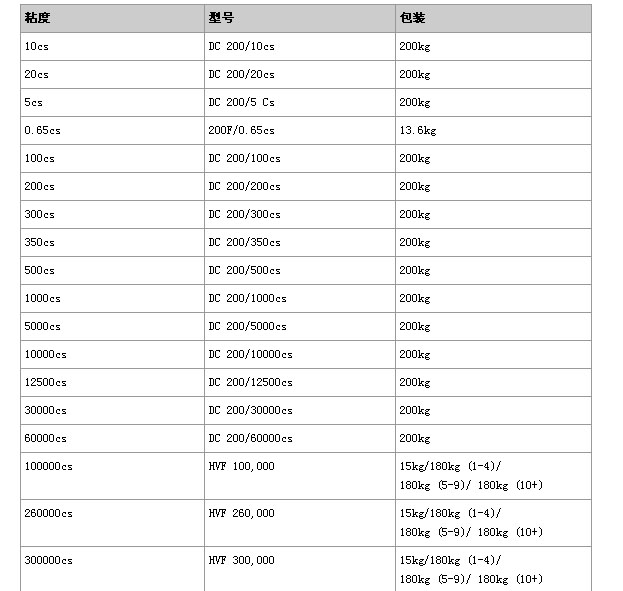 粘度 型号 包装 10cs DC 200/10cs 200kg 20cs DC 200/20cs 200kg 5cs DC 200/5 Cs 200kg 0.65cs 200F/0.65cs 13.6kg 100cs DC 200/100cs 200kg 200cs DC 200/200cs 200kg 300cs DC 200/300cs 200kg 350cs DC 200/350cs 200kg 500cs DC 200/500cs 200kg 1000cs DC 200/1000cs 200kg 5000cs DC 200/5000cs 200kg 10000cs DC 200/10000cs 200kg 12500cs DC 200/12500cs 200kg 30000cs DC 200/30000cs 200kg 60000cs DC 200/60000cs 200kg 100000cs HVF 100,000 15kg/180kg (1-4)/ 180kg (5-9)/ 180kg (10+) 260000cs HVF 260,000 15kg/180kg (1-4)/ 180kg (5-9)/ 180kg (10+) 300000cs HVF 300,000 15kg/180kg (1-4)/ 180kg (5-9)/ 180kg (10+) 600000cs HVF 600,000 15kg/180kg (1-4)/ 180kg (5-9)/ 180kg (10+) |