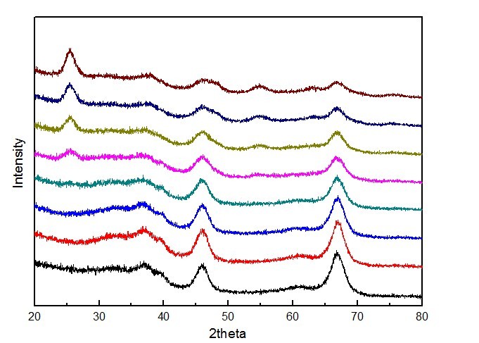 本人做了一些银铝催化剂掺杂了不同含量的TiO2,发现随着掺杂量的增加,氧化铝的衍射峰不断减少甚至出现了衍射峰宽化的现象,究竟是什么原因呢?刚接触XRD,不太懂。ps:图从下至上分别掺杂了0%、1%、5%、10%、20%、30%、40%、50%TiO2(以氧化铝的质量为基准)