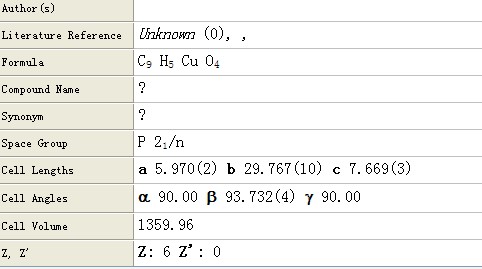 帮忙查下这个配合物做过没啊?我没CCDC,查不了啊,谢谢了! 晶胞参数:a 5.970(2) b 29.767(10) c 7.669(3) a 90.00 b 93.732(4) g 90.00 P21/n V = 1359.96 [ Last edited by xingyu6203 on 2011-9-24 at 09:57 ] |