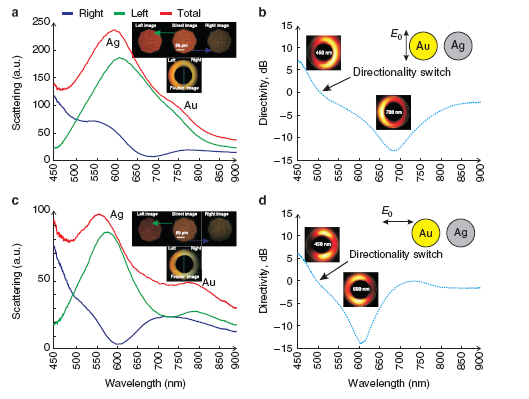 | Recent progress in nanophotonics includes demonstrations of meta-materials displaying negative refraction at optical frequencies, directional single photon sources, plasmonic analogies of electromagnetically induced transparency and spectacular Fano resonances. The physics behind these intriguing effects is to a large extent governed by the same single parameter—optical phase. Here we describe a nanophotonic structure built from pairs of closely spaced gold and silver disks that show phase accumulation through material-dependent plasmon resonances. The bimetallic dimers show exotic optical properties, in particular scattering of red and blue light in opposite directions, in spite of being as compact as ~λ3/100. These spectral and spatial photon-sorting nanodevices can be fabricated on a wafer scale and offer a versatile platform for manipulating optical response through polarization, choice of materials and geometrical parameters, thereby opening possibilities for a wide range of practical applications. |