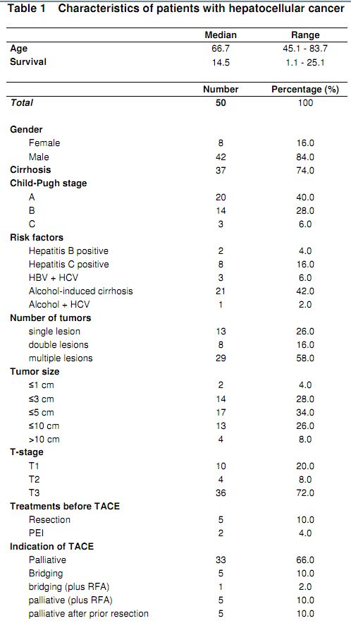 这里的“周期”应该是普通意义上的“治疗周期”,或者说“疗程”。 表中"Number of TACE cycle"这一项对应的列表方式让我们感到陌生,其实并没有问题。具体来说,各行对应的数字可以如下理解—— 第1个疗程:治疗了21次(21个病人接受了第1个疗程的治疗); 第2个疗程:治疗了20次(20个病人接受了第2个疗程的治疗); 第3个疗程:治疗了16次(16个病人接受了第3个疗程的治疗); 第4个疗程:治疗了7次(7个病人接受了第4个疗程的治疗); 第5个疗程:治疗了7次(7个病人接受了第5个疗程的治疗)。 |