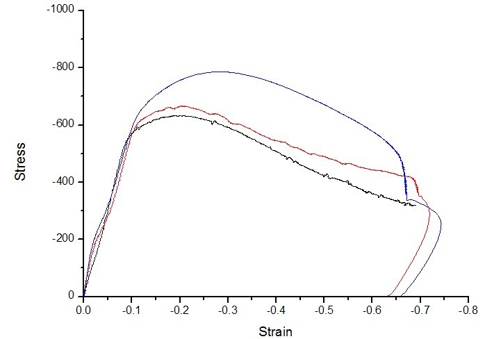 你上面的是工程应力应变曲线,下面是真应力真应变曲线,有公式可以转化的,我在这上面打不出来,上面曲线strain怎么会往回走?这是什么材料?