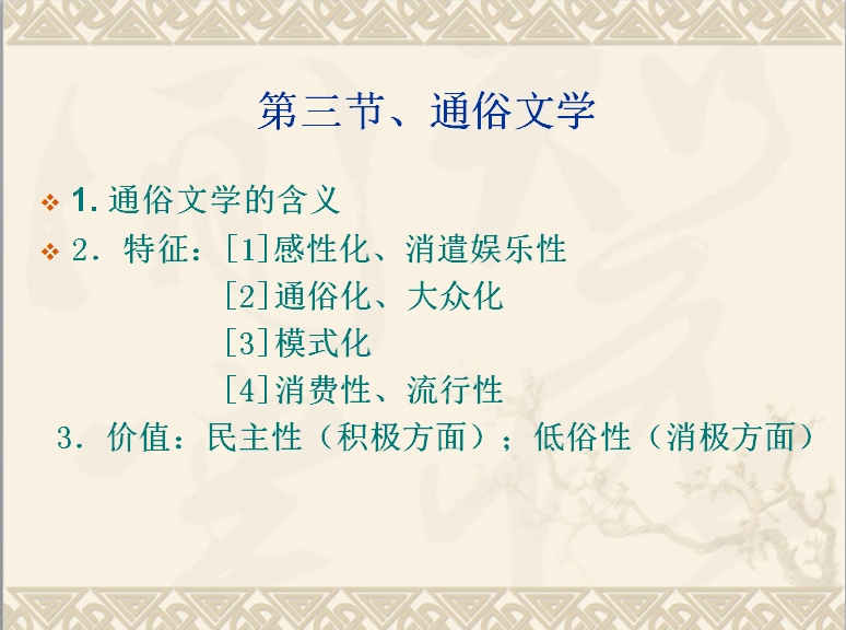 文学概论课程的教学内容包括: [1] 总体论,介绍文学的性质、文学的起源、文学的历史发展、文学的社会作用。 [2] 文本论,分析文本的结构和意义、文学语言、文学的叙述方式、文学的类型和体裁等。 [3] 创作论,包括文学创作的主体和客体、文学创作过程、文学创作的原则、文学思潮、文学流派等。 [4] 接受论,分析文学接受原理、文学接受类型、文学接受过程、文学接受标准等。 该课程教学目的有两个。从学术上讲,是探讨文学现象的本质和规律,对丰富生动的文学现象作出解释,从而对人类的精神世界作出探索。从社会任务上讲,是指导文学活动,对于作者和读者发挥影响,指导他们的文学创作和鉴赏活动 。 [ 来自科研家族 快乐检索 ] |