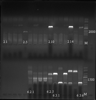 我之前探讨过类似的问题了,今天在小议一下: 1. 楼主的问题说的不是很清楚。用的是什么载体?菌液PCR是如何选用引物的?退火温度是怎么选择的? 这种电泳结果说明,你的引物特异性不是很高,引物可能在转化菌株的基因组上又结合位点。上面那个图中,有你要的目的条带,但是有些条带不是很清楚,原因可能很多,如模板量、DNA聚合酶用量的差异的等。这个可以不用管,这个实验是有和无的关系,可以选三个有目的带的样品测序,最终结果是以测序为准的,菌体PCR只是初步筛选的过程。 2. 感觉是你引物选用的不对。我们常用的载体上都用通用的测序引物(如如M13F、M13R、T7、Sp6等,若真没有,可以自行设计一条20bp左右的引物),可以和你目的片段的一条引物配对,这个可以以没有外源片段的载体作对照,这样获得的结果可行对比较高。不能直接用扩增你目的片段的方法,没有说服力; 3. 菌体电泳,直接用碱裂解法的溶液I和溶液II裂解菌体后,进行电泳,以没有外源片段的载体作对照,条带相对滞后样品就是应该是连入外源片段的。 4. 可以酶切载体,再以没有连接外源片段载体的酶切产物作对照。这个方法比较麻烦,不推荐。 通过这几种方法筛选到的阳性克隆,直接以菌体送去测序公司测序分析。你所要的阳性克隆,最终还是要通过测序结果的序列分析确定。 |